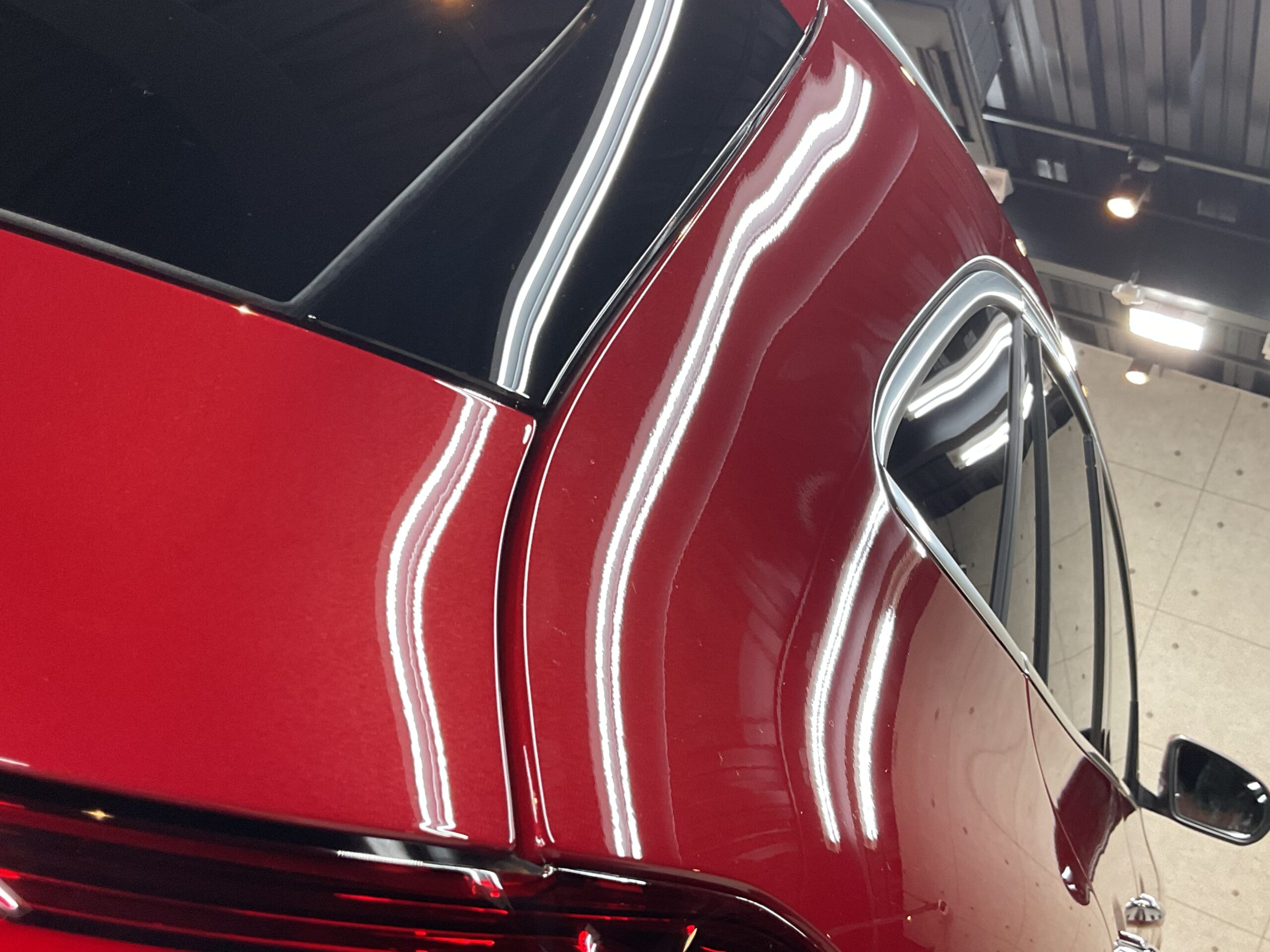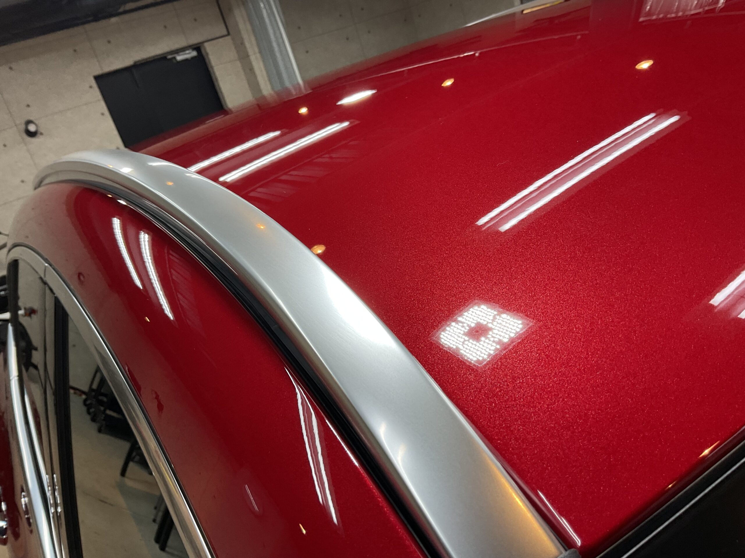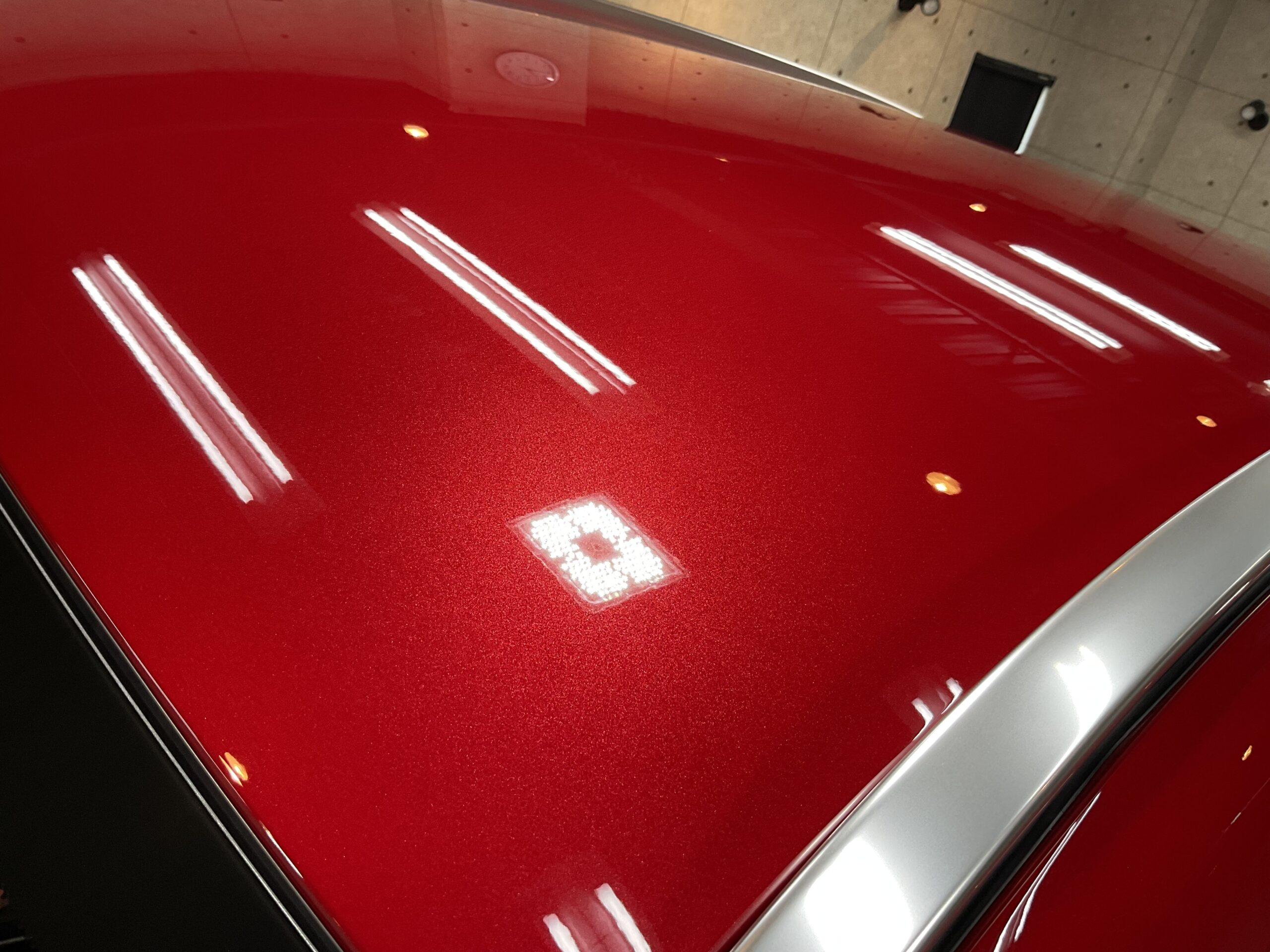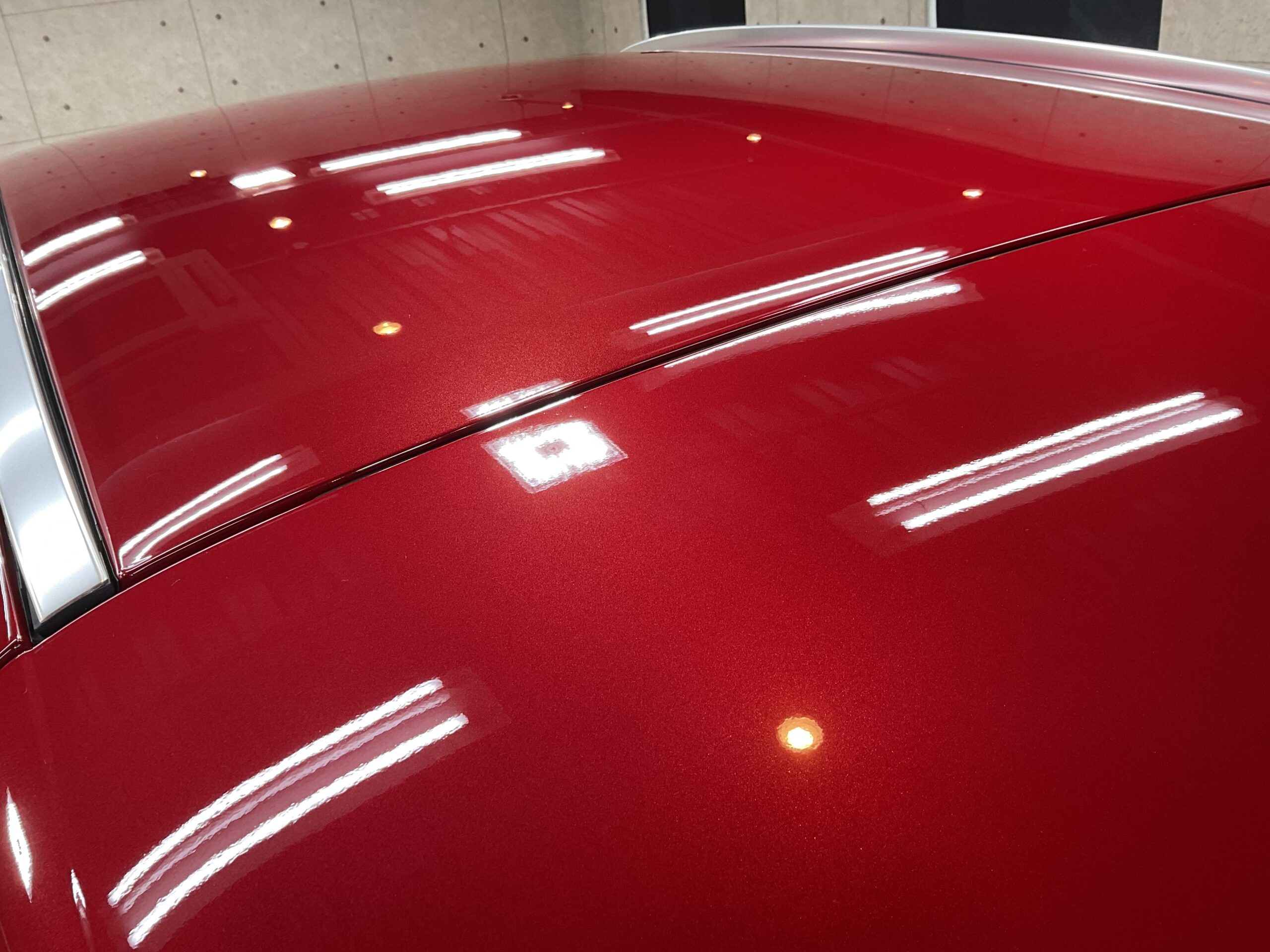 下地処理は、最初に手洗い洗車・鉄粉取りを行い、次に【Revolt Adjust System】と呼ばれるボディ研磨を行い、数ヵ所に付着していた水シミ、小キズを可能な範囲で丁寧に除去していきました。その結果、塗装本来の艶を取り戻すことができ、ピカピカな状態になりました。