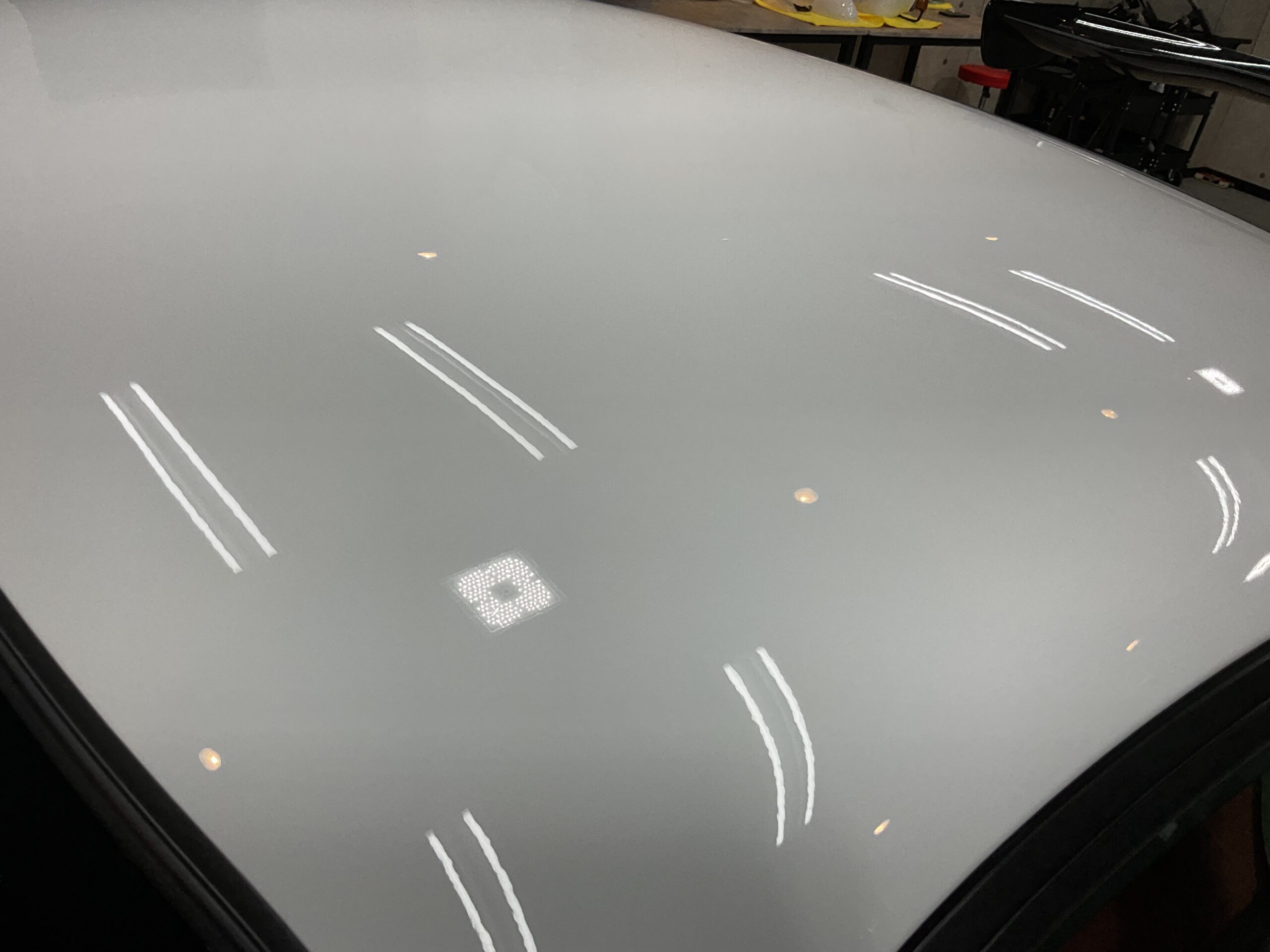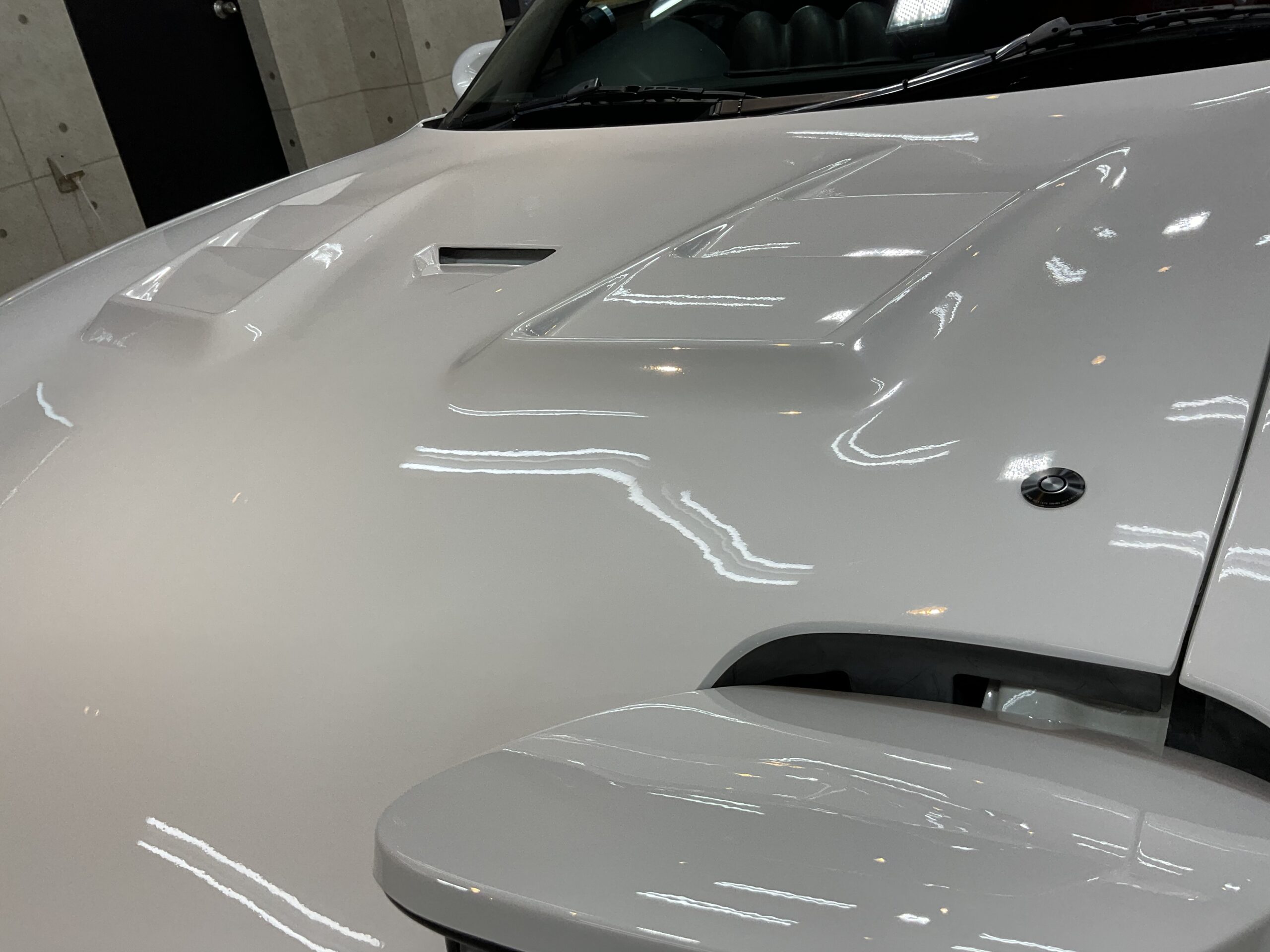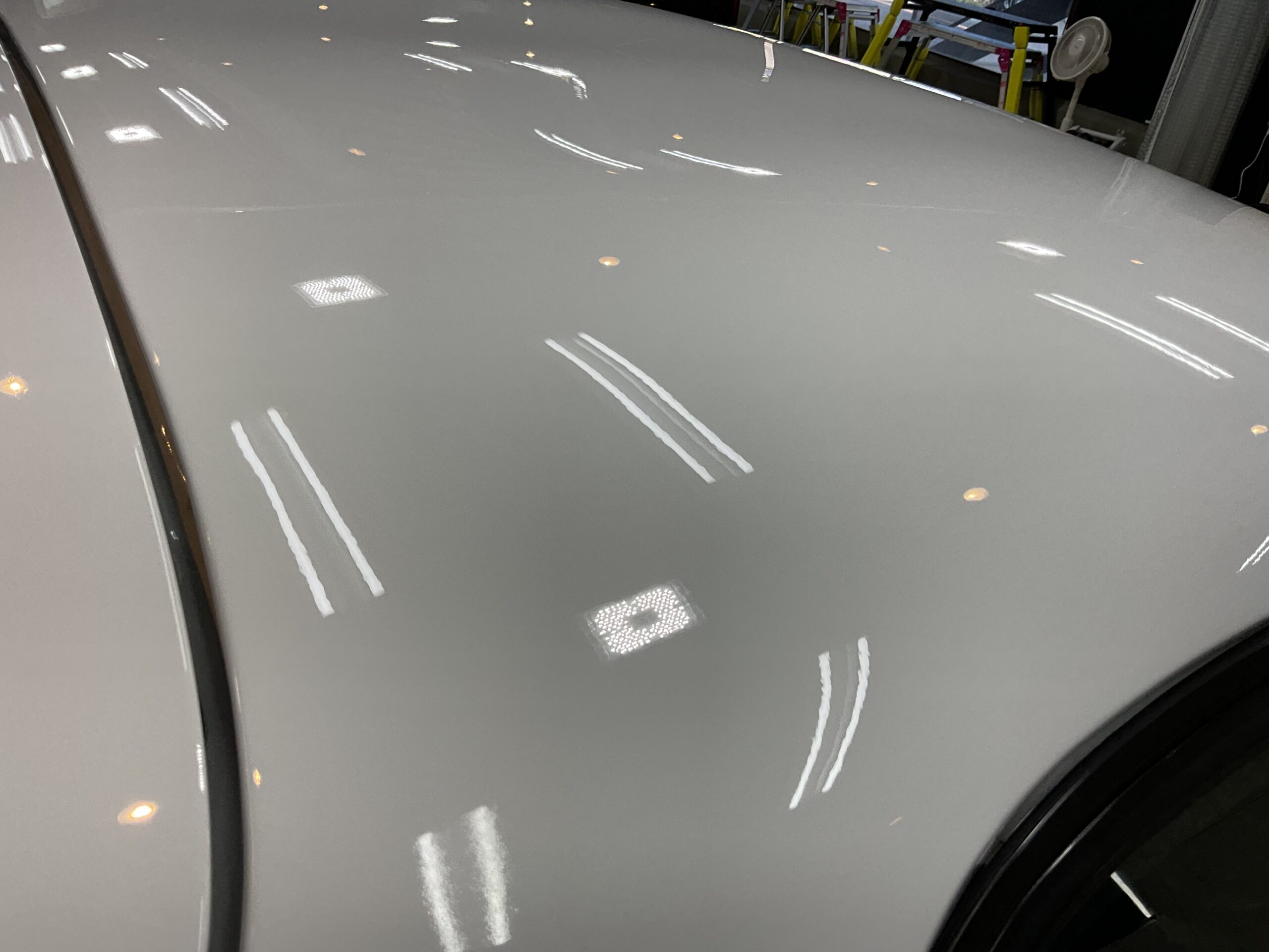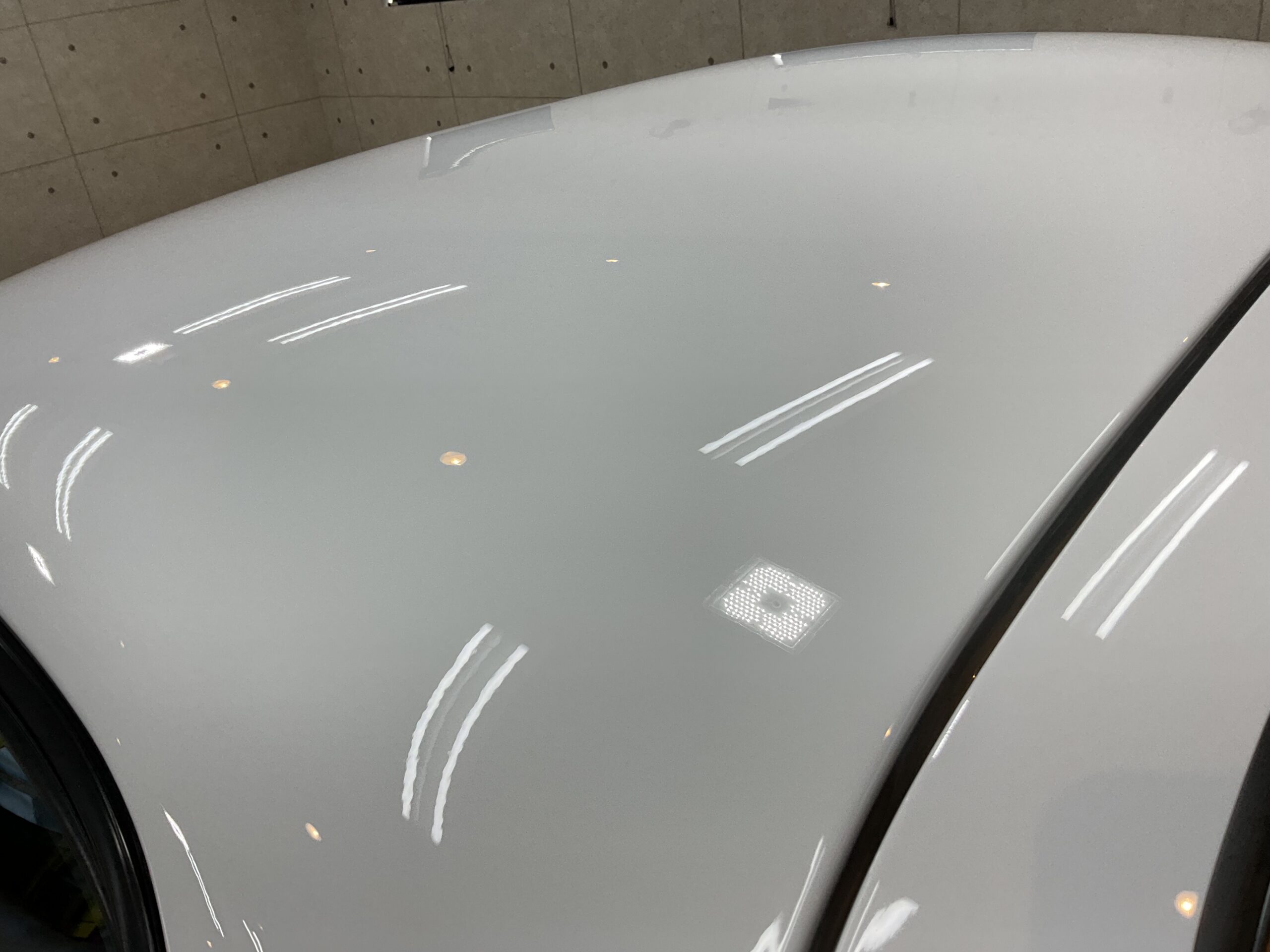 下地処理は、最初に手洗い洗車・鉄粉取りを行い、次に【Revolt Adjust System】と呼ばれるボディ研磨を行い、数ヵ所に付着していた水シミ、小キズを可能な範囲で丁寧に除去していきました。その結果、塗装本来の艶を取り戻すことができ、ピカピカな状態になりました。