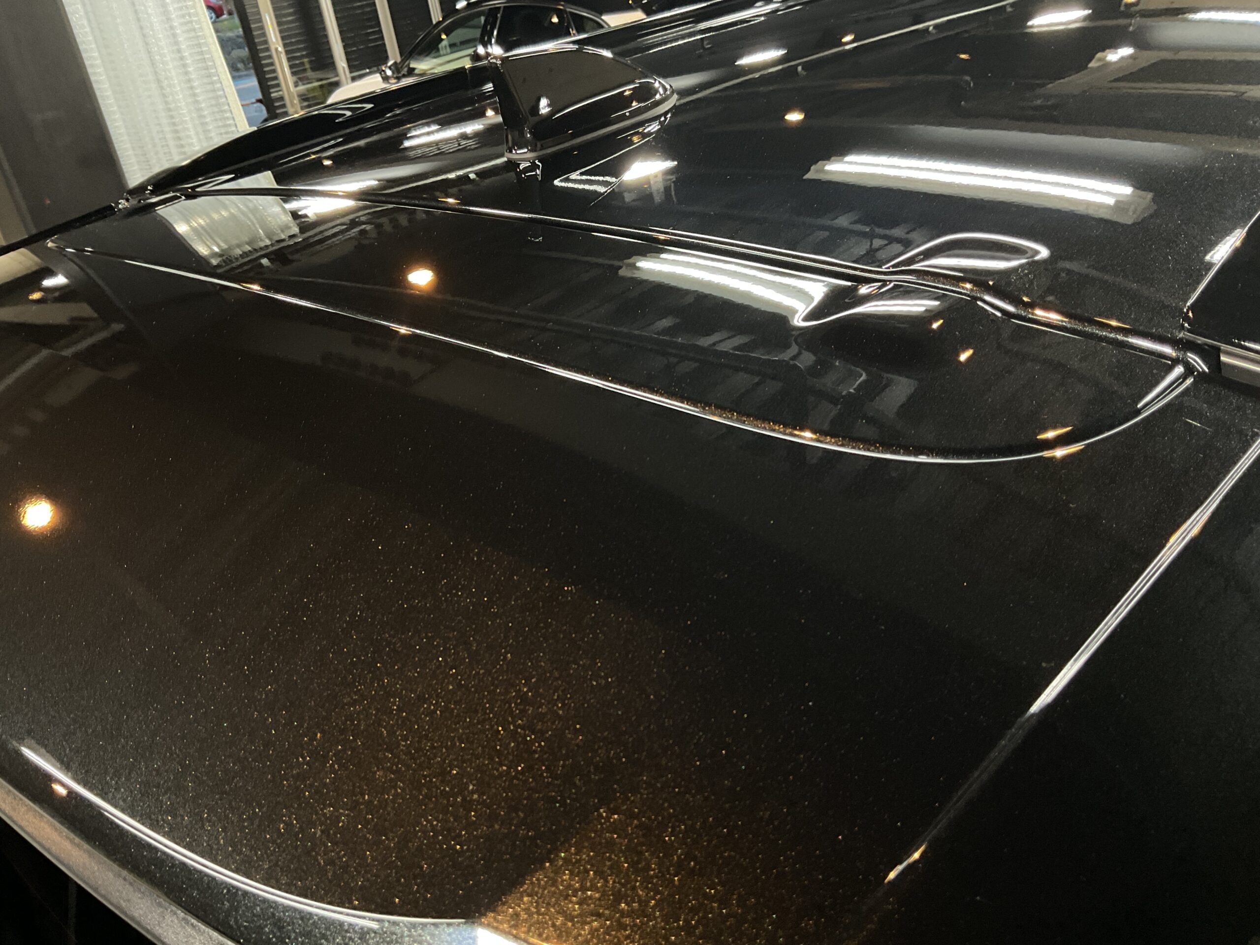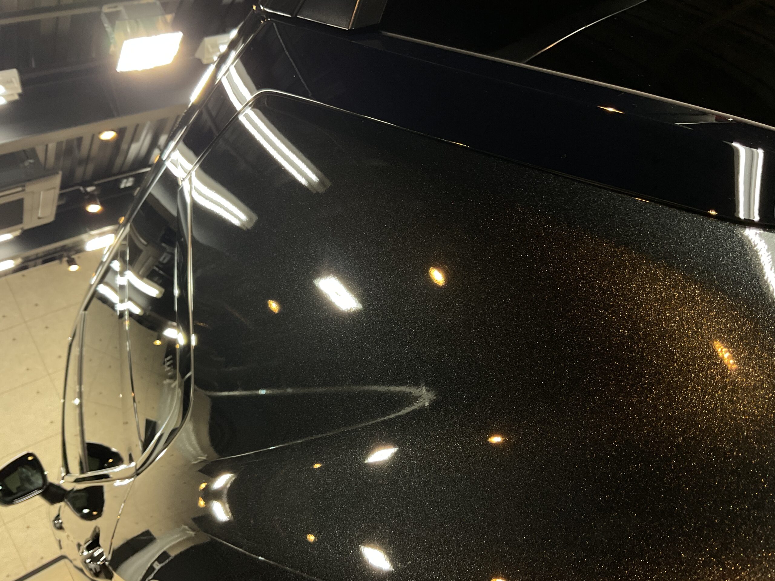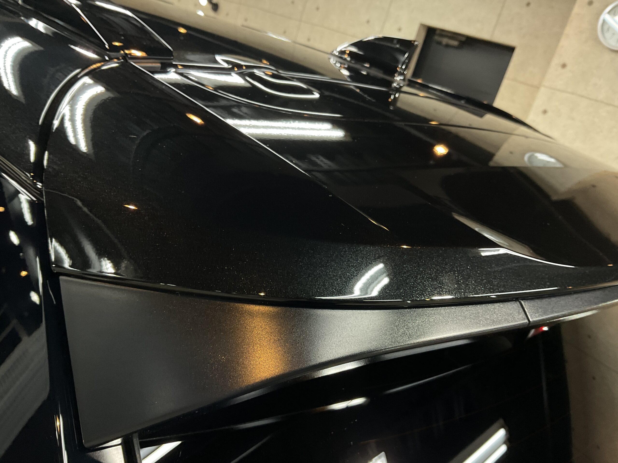ボディ研磨後は、再度手洗い洗車を行ってボディ表面に付着している埃などを除去してから、コーティング施工をさせていただきました。今回は、リボルト・プロ エクストリームを施工させていただきましたので、1層目に無溶剤で完全硬化型のセラミックコーティング剤【リボルト・プロ エクストリーム用 ベースコート】と2層目に紫外線軽減(UVカット)効果のあるガラス系コーティング剤【トップコート】を塗布した後、仕上げとして、より水シミが付きにくくなり、撥水効果をもたらす3層目の【オーバートップコート】を塗布して仕上げをさせていただいたことによって、さらにボディ塗装の艶・輝きが増して非常にキレイに仕上がりました。