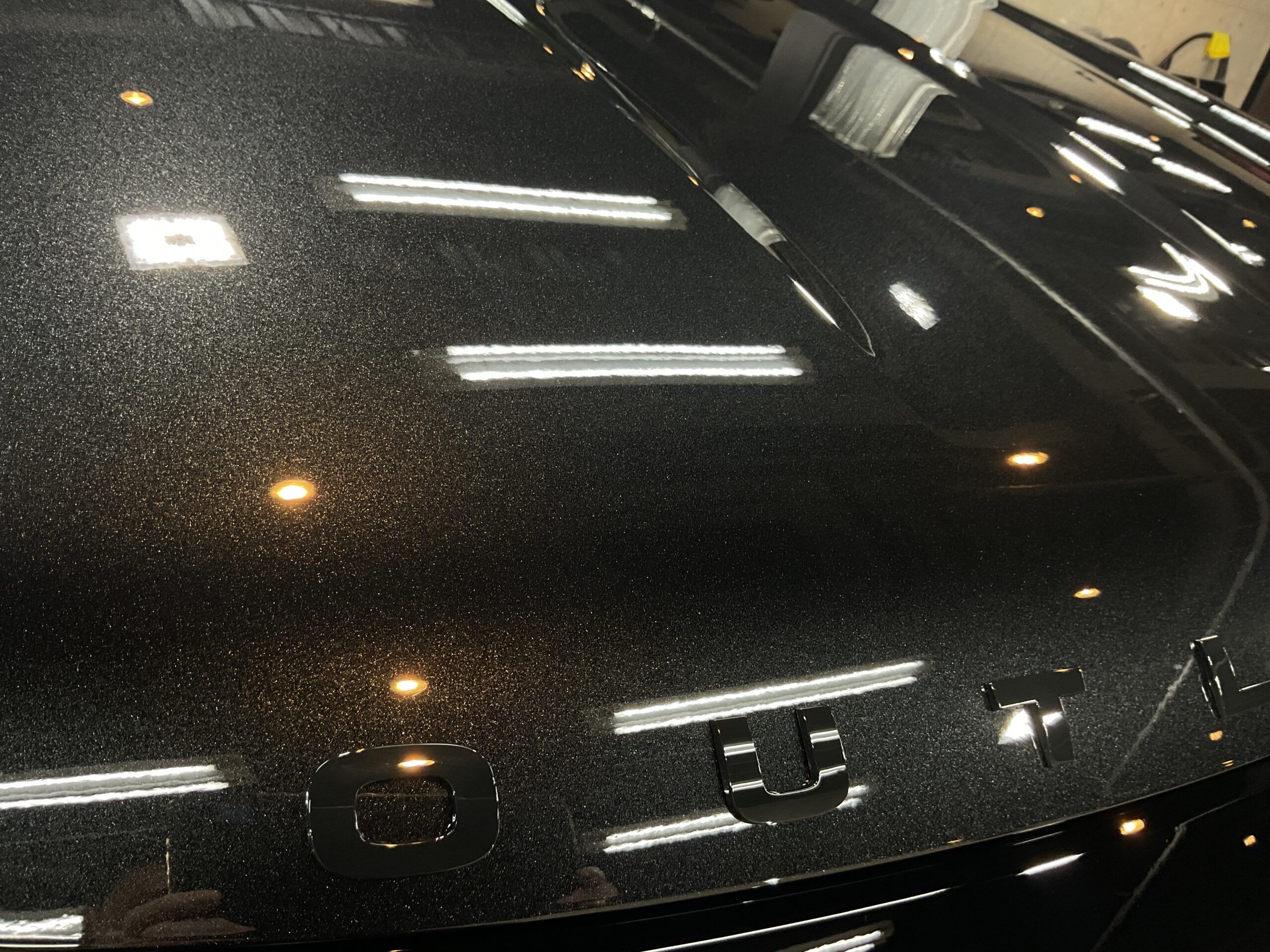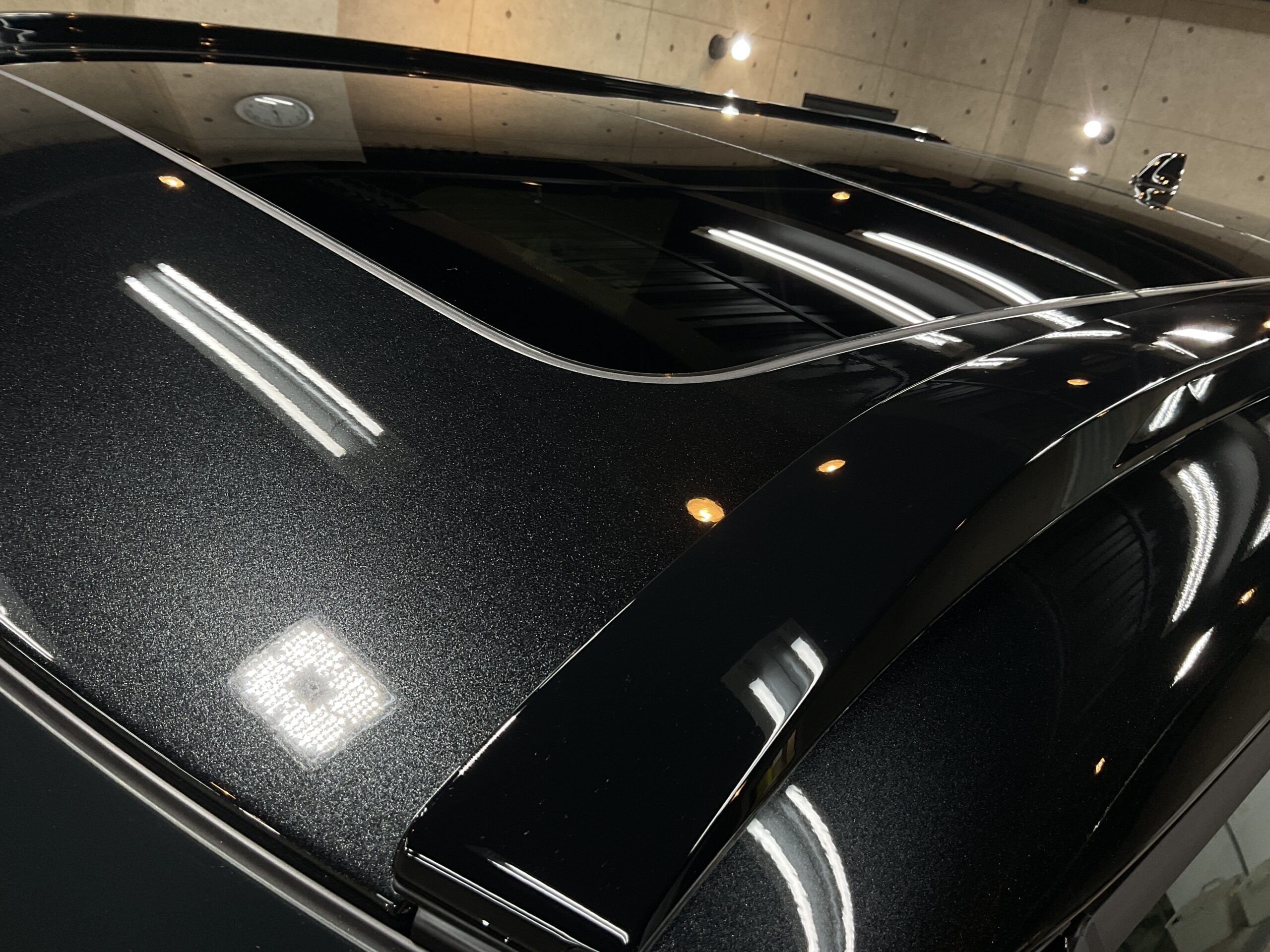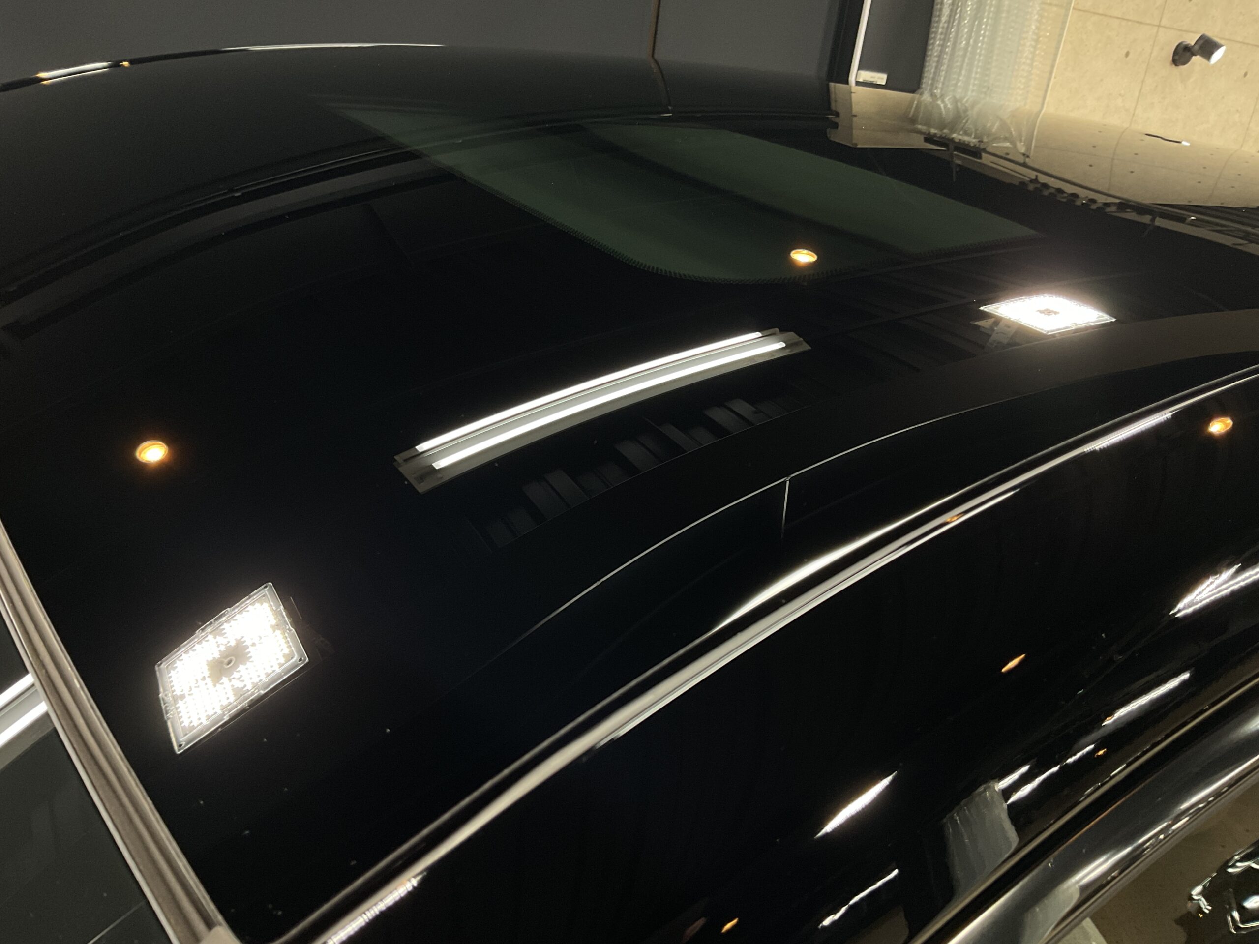 ボディ研磨後は、再度手洗い洗車を行ってボディ表面に付着している埃などを除去してから、コーティング施工をさせていただきました。今回は、リボルト・プロ エクストリームを施工させていただきましたので、1層目に無溶剤で完全硬化型のセラミックコーティング剤【リボルト・プロ エクストリーム用 ベースコート】と2層目に紫外線軽減(UVカット)効果のあるガラス系コーティング剤【トップコート】を塗布した後、仕上げとして、より水シミが付きにくくなり、撥水効果をもたらす3層目の【オーバートップコート】を塗布して仕上げをさせていただいたことによって、さらにボディ塗装の艶・輝きが増して非常にキレイに仕上がりました。